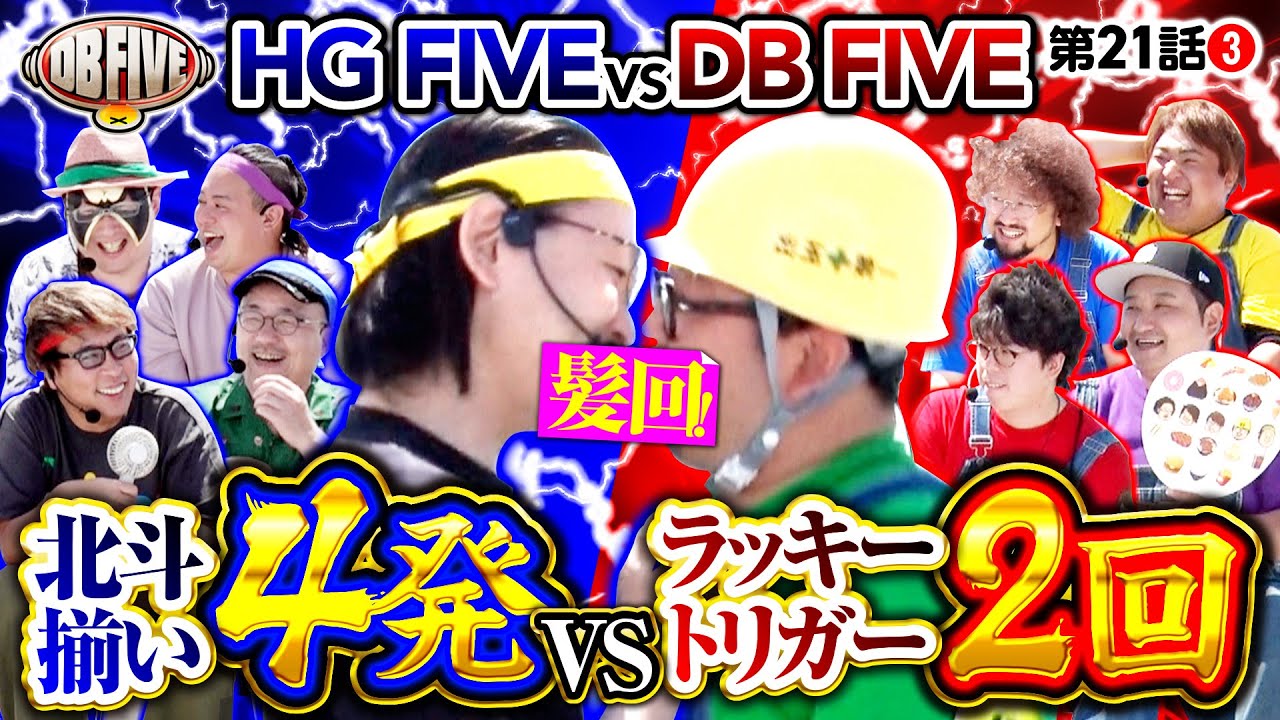 HG FIVEのシーサ。が無想転生にブチ込み、一気にリードしたかに見えた勝負だがDBも負けていない! 秋山のラッキートリガーとガット石神の連チャンで勝負はまだまだわからない。HGの北斗揃いとDBのラッキートリガー、勝利の女神はどっちに微笑む?